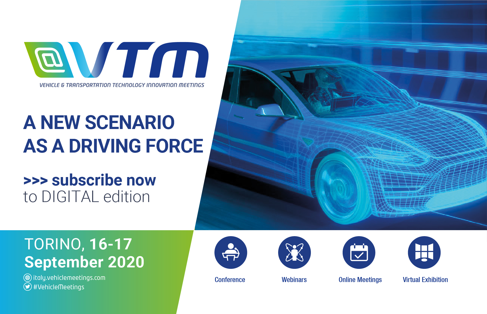 VTM doubles! Before VTM 2021 (Torino, 30-31 March), you have the opportunity to keep you updated and to stay in touch with the automotive and transportation world community thanks to @VTM (16-17 September 2020), the innovative combined on-site and on-line event.